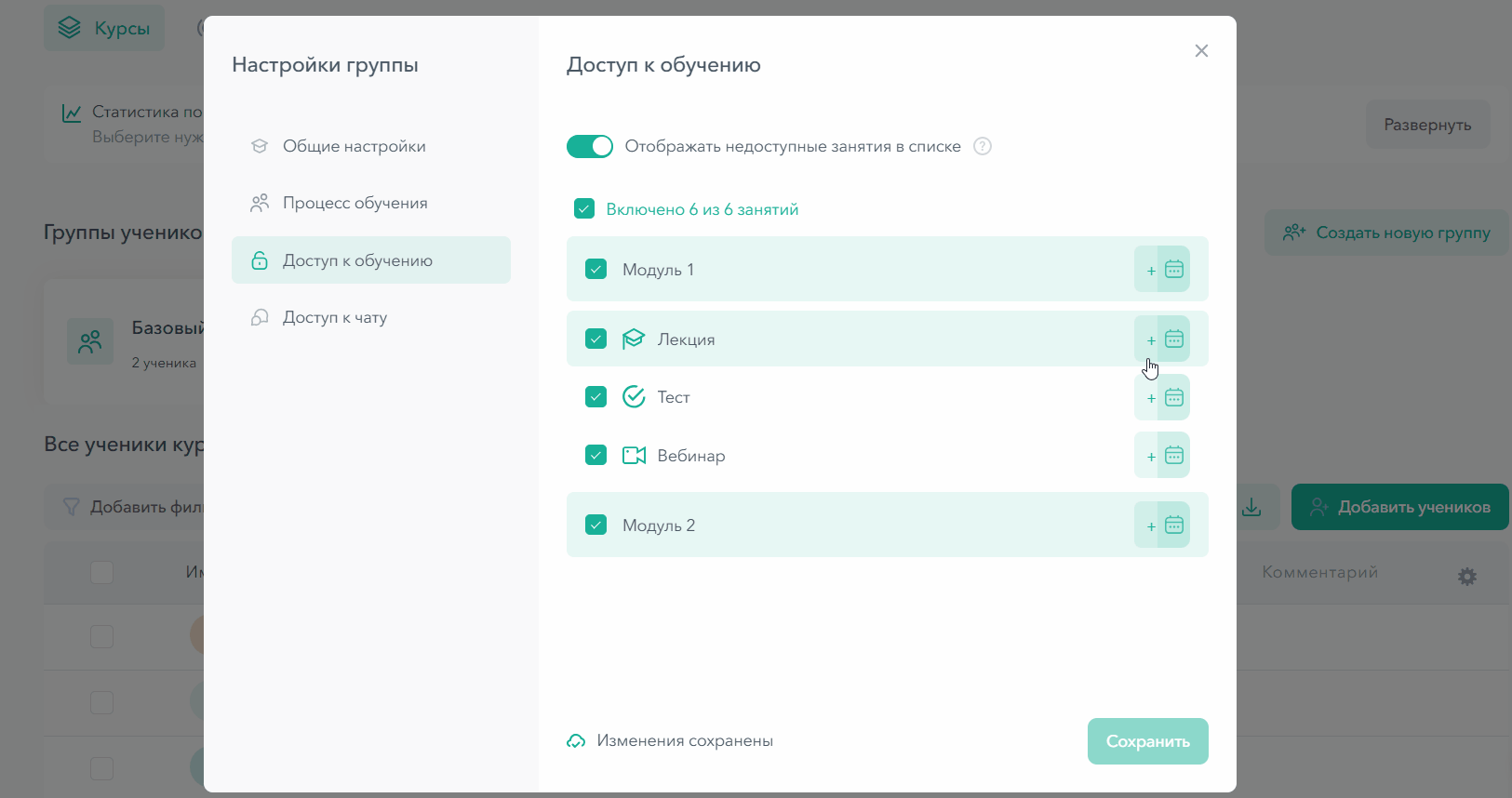 3. Задать дату и время открытия для каждого урока отдельно. Для этого в разделе доступ к обучению нужно нажать на иконку календаря напротив занятия, а затем выбрать дату и время