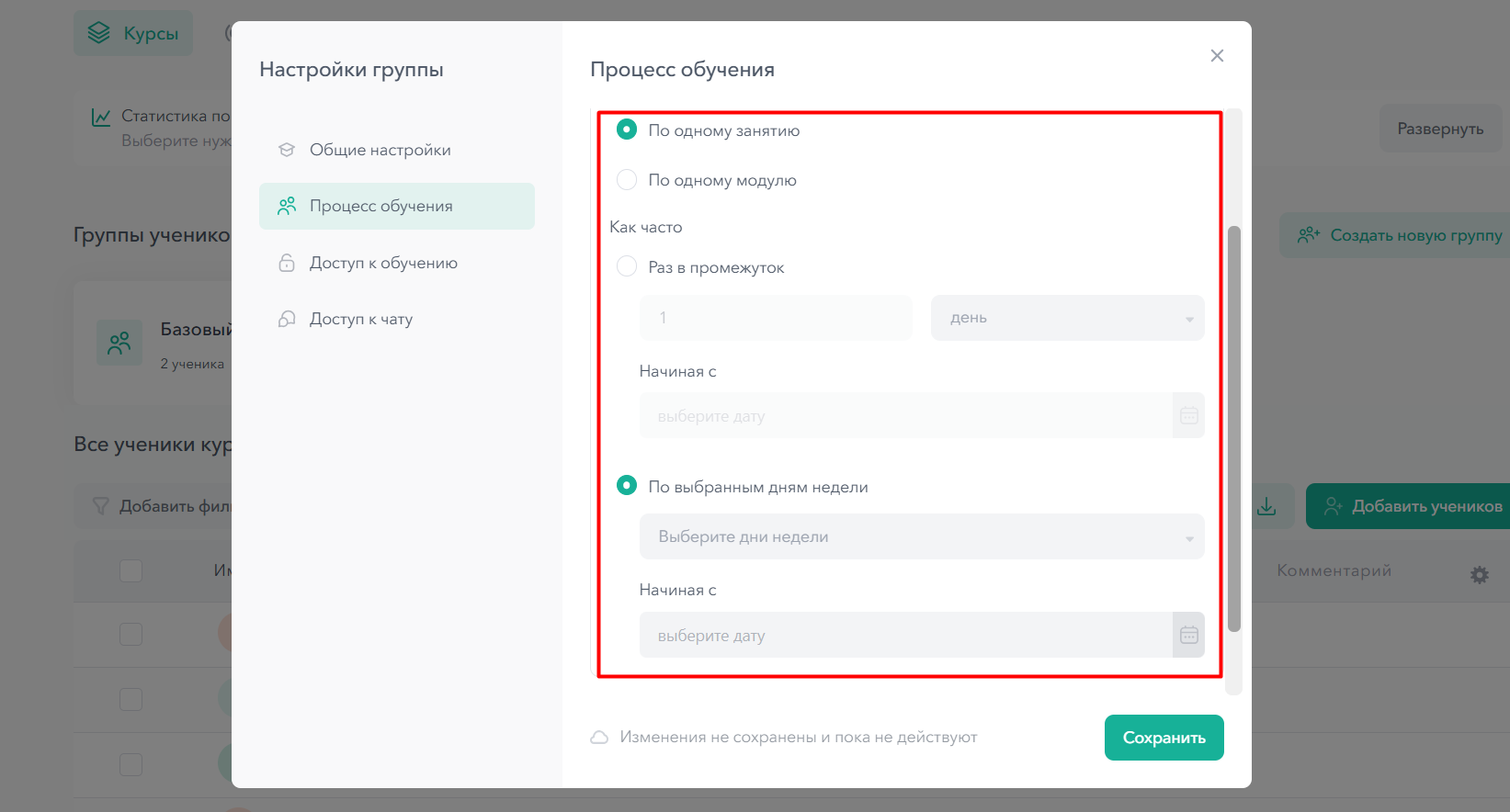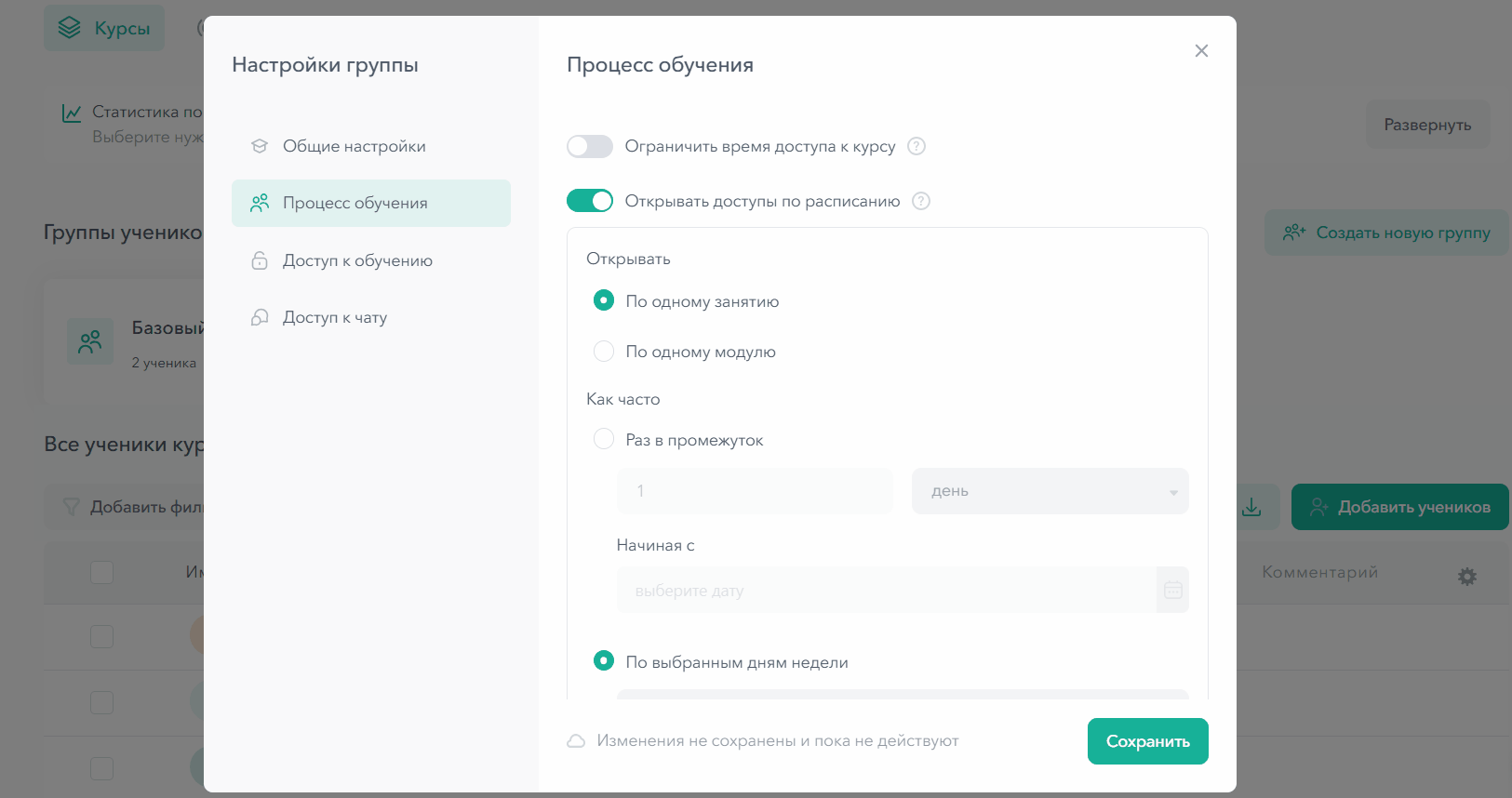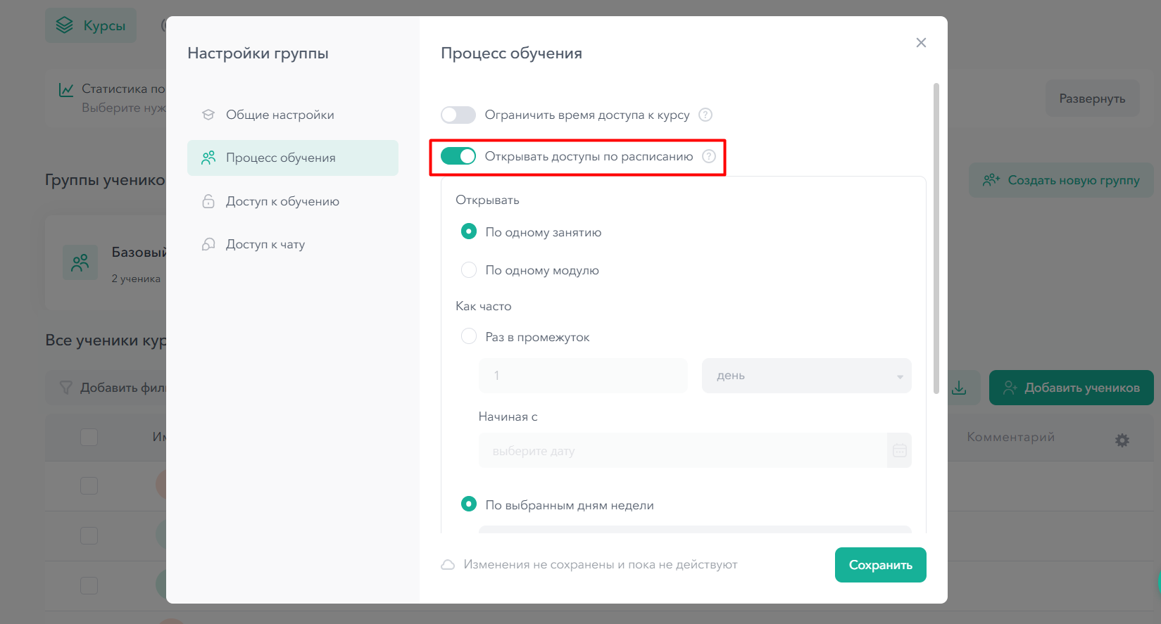 В настройках группы перейдите в раздел Процесс обучения — Открывать доступы по расписанию