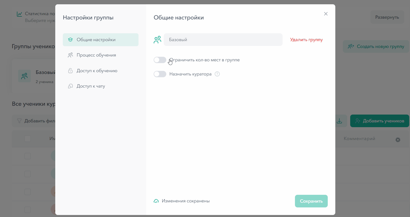 - Удалить группу (при удалении доступ к курсу будет закрыт для всех ее участников)