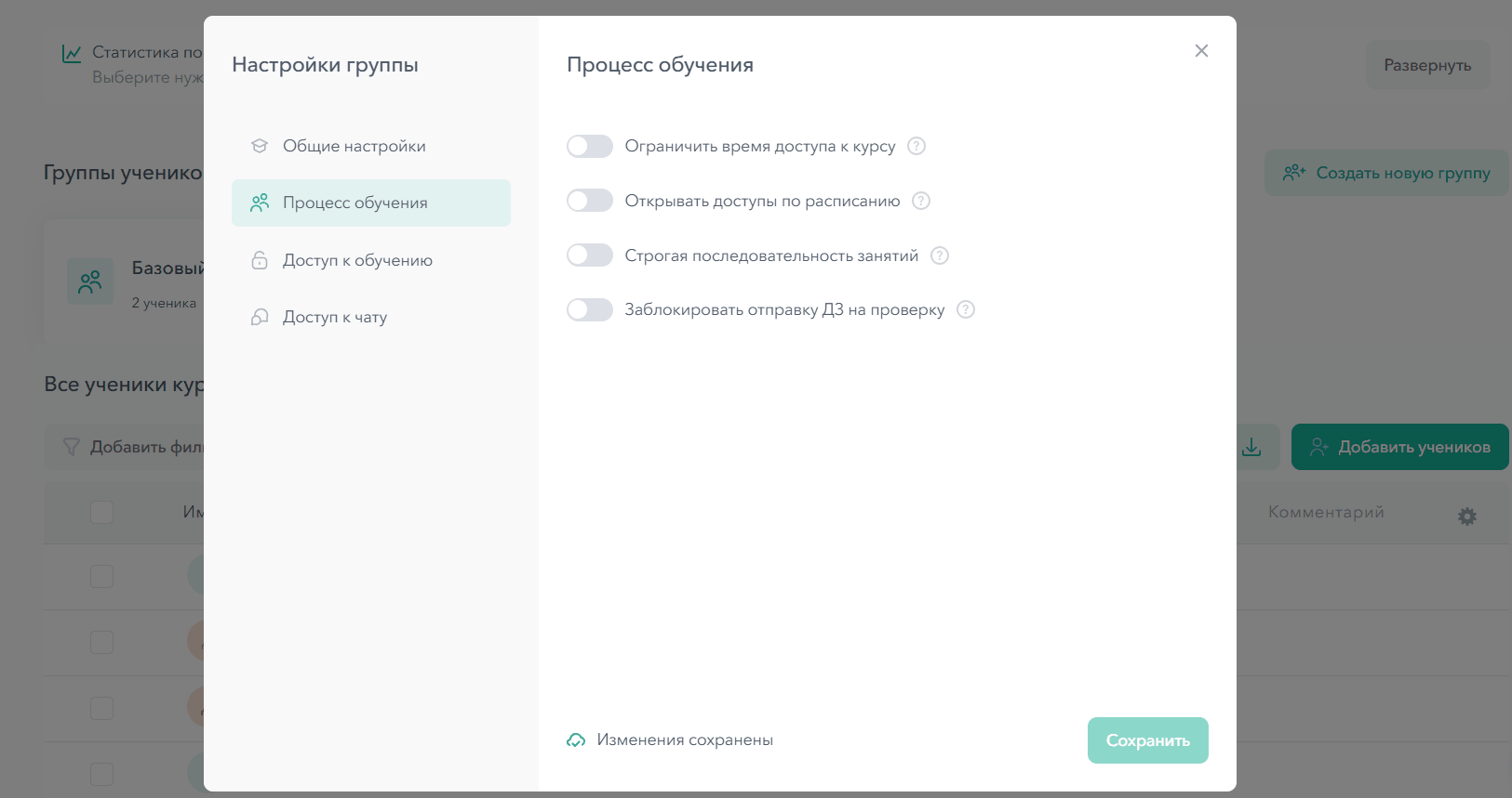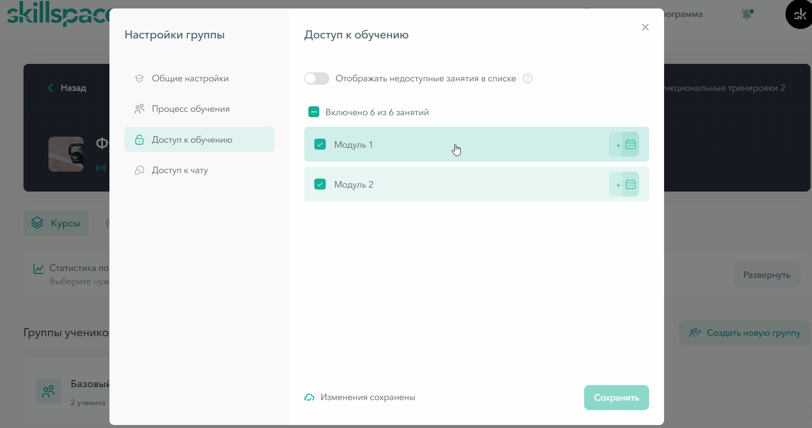 - Выбрать, какие модули и уроки будут доступны ученикам данной группы, отметив их галочками