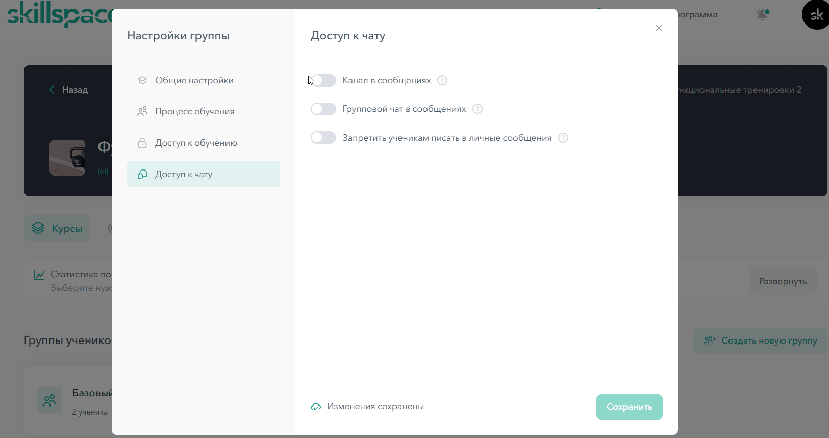 В окне настройки группы есть 4 раздела: Общие настройки, Процесс обучения, Доступ к обучению, Доступ к чату: