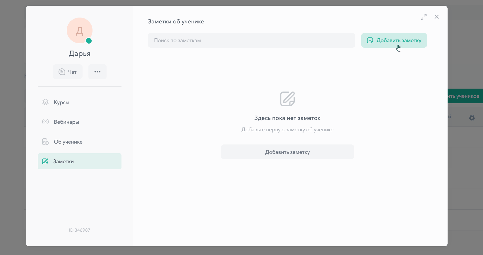Нажмите на кнопку «Добавить заметку» и зафиксируйте важные детали: текстовые комментарии, файлы, ключевые моменты работы с учеником. У каждой записи видно автора, дату и время.