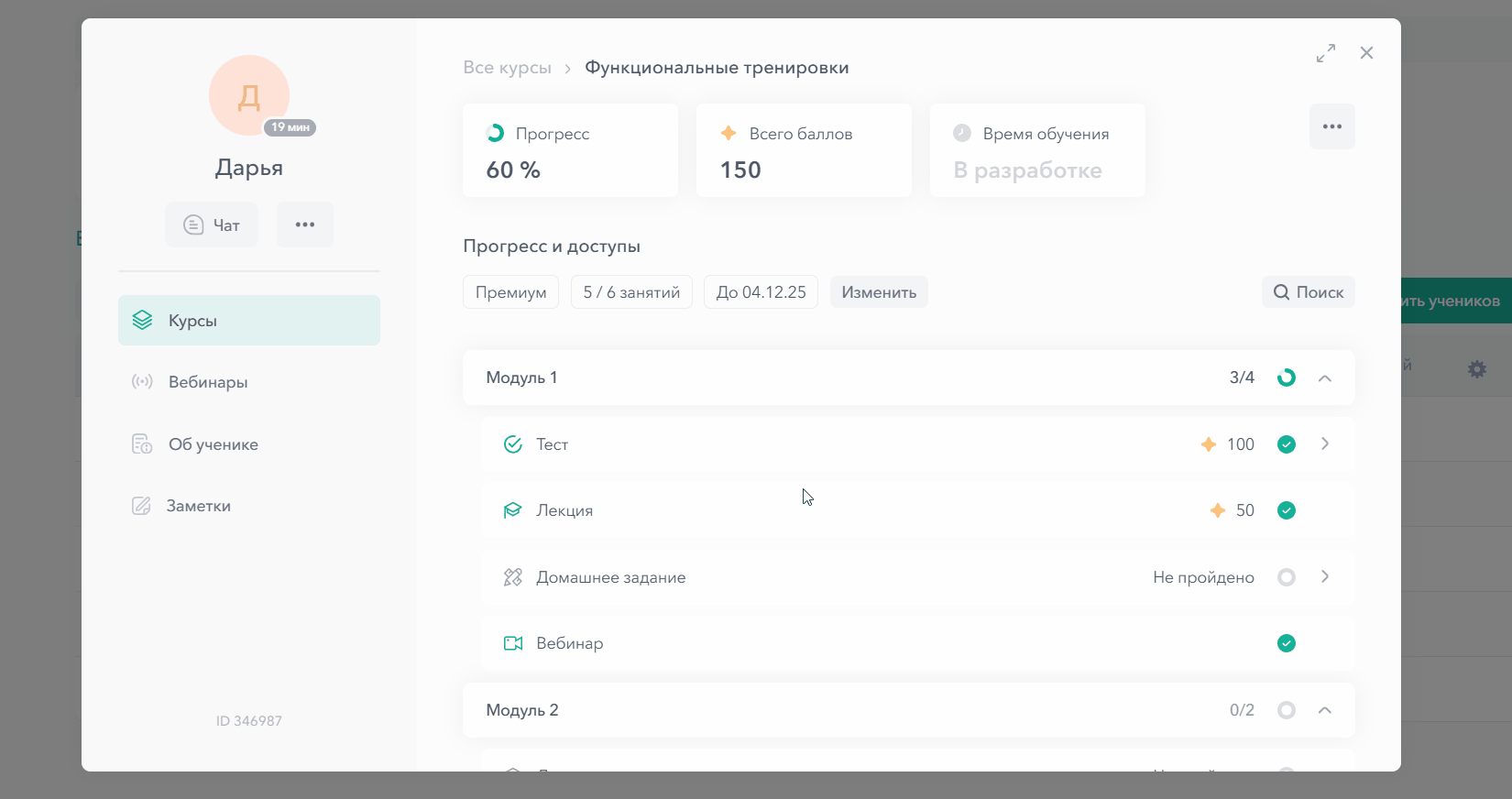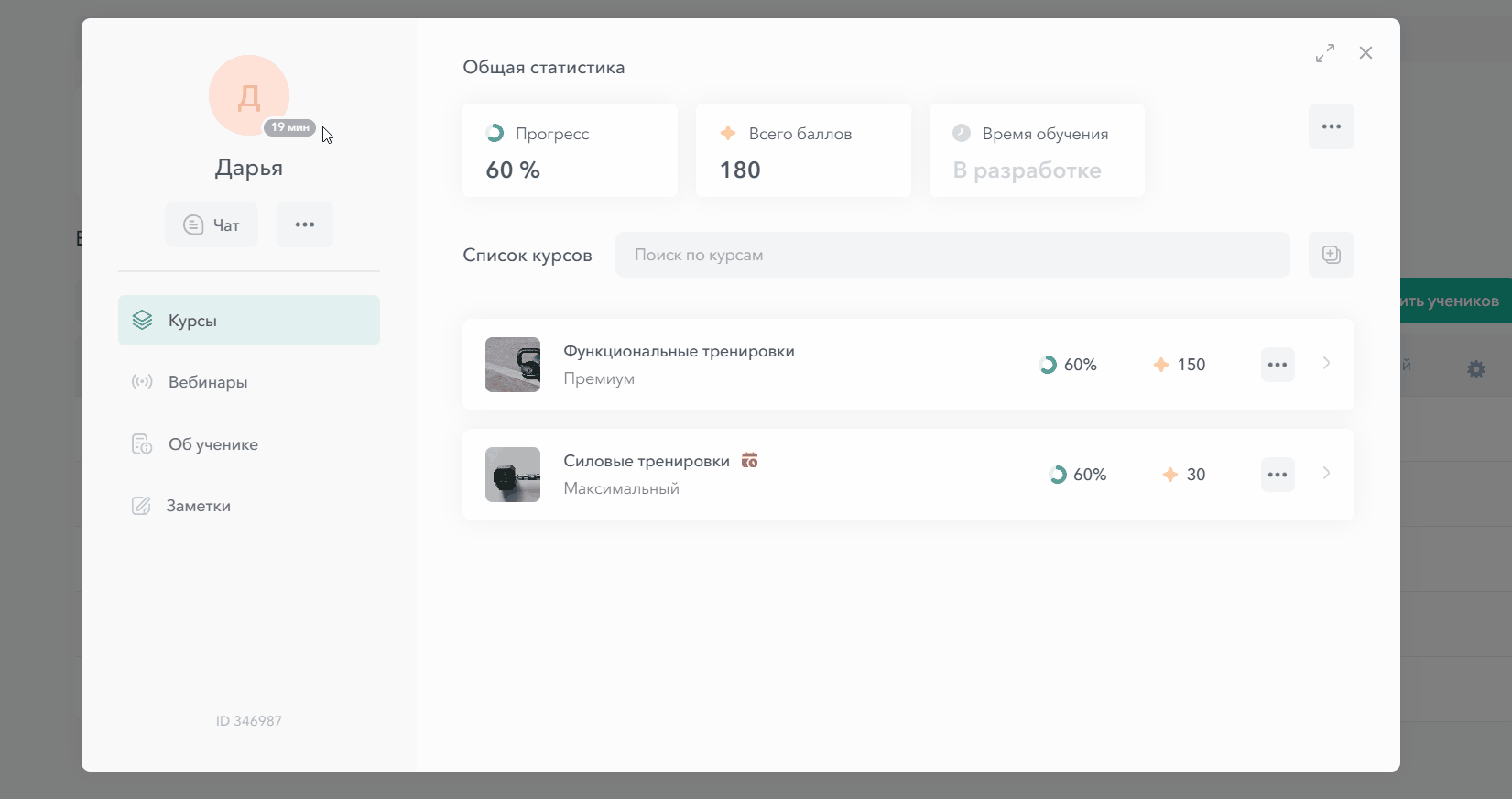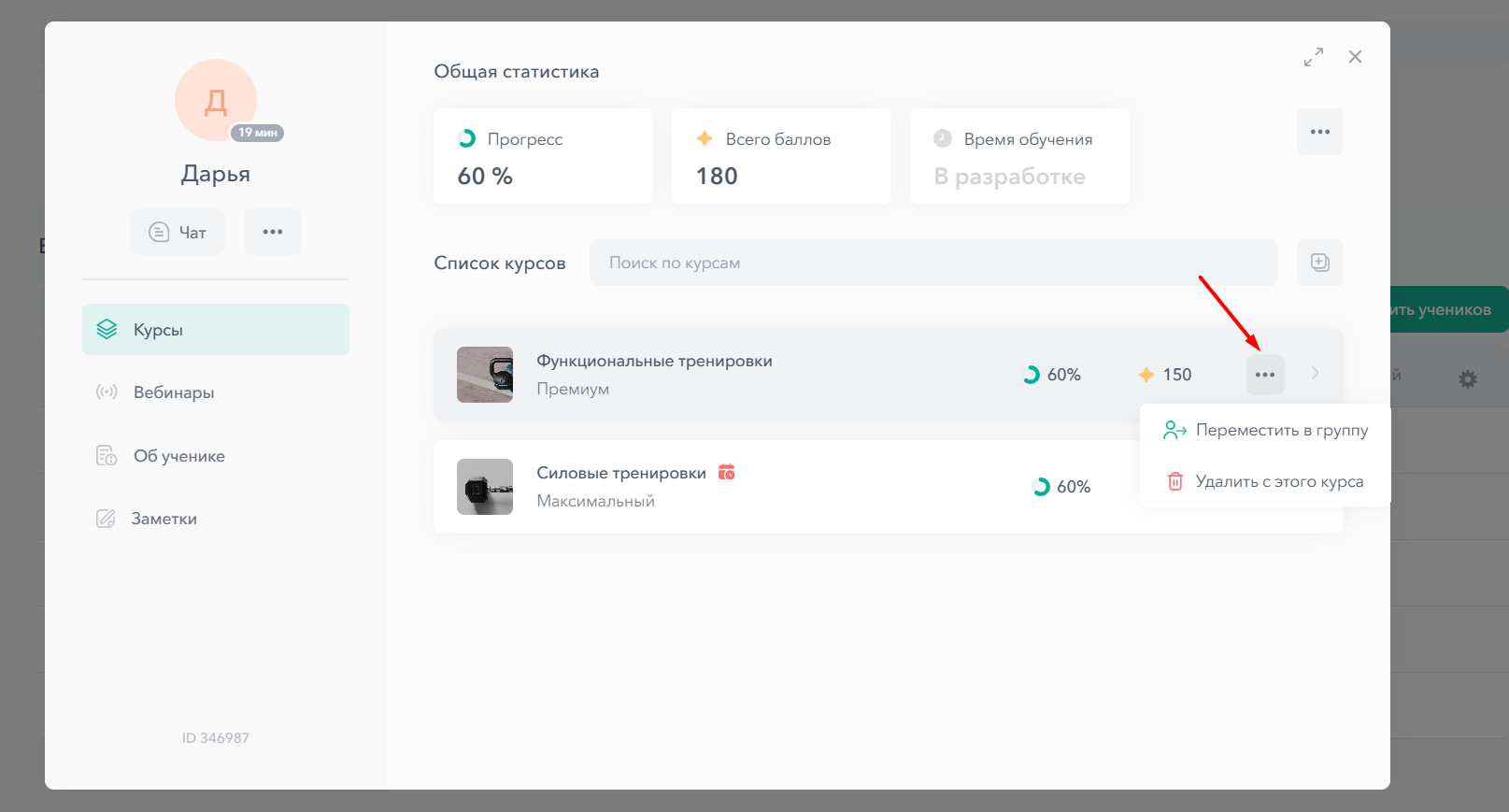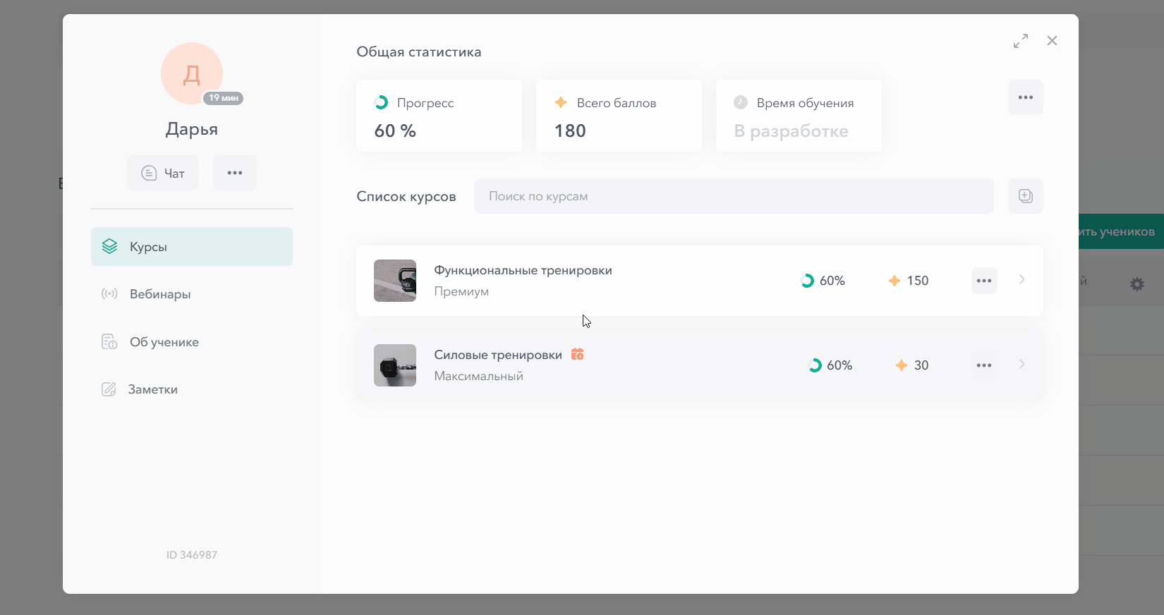 Ниже расположены разделы (курсы, вебинары, об ученике, заметки), а справа отображается информация по выбранному разделу.
