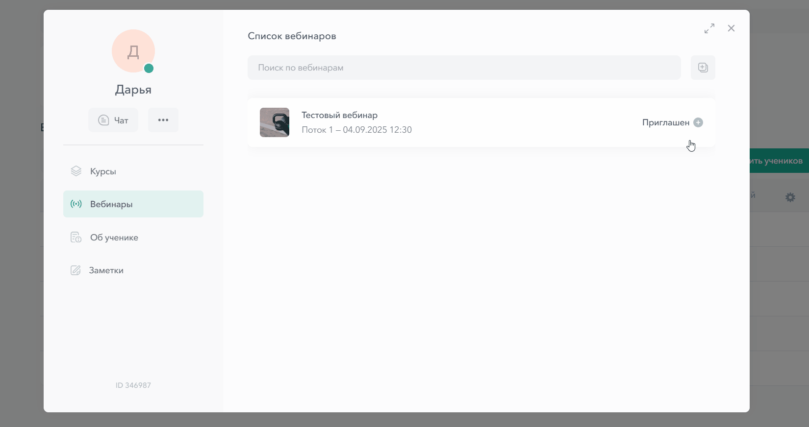 Здесь вы можете посмотреть информацию по вебинарам, в которых состоит ученик и статус его участия (приглашен/регистрация/посещение/просмотр записи). Также, можно пригласить ученика на другие вебинары.