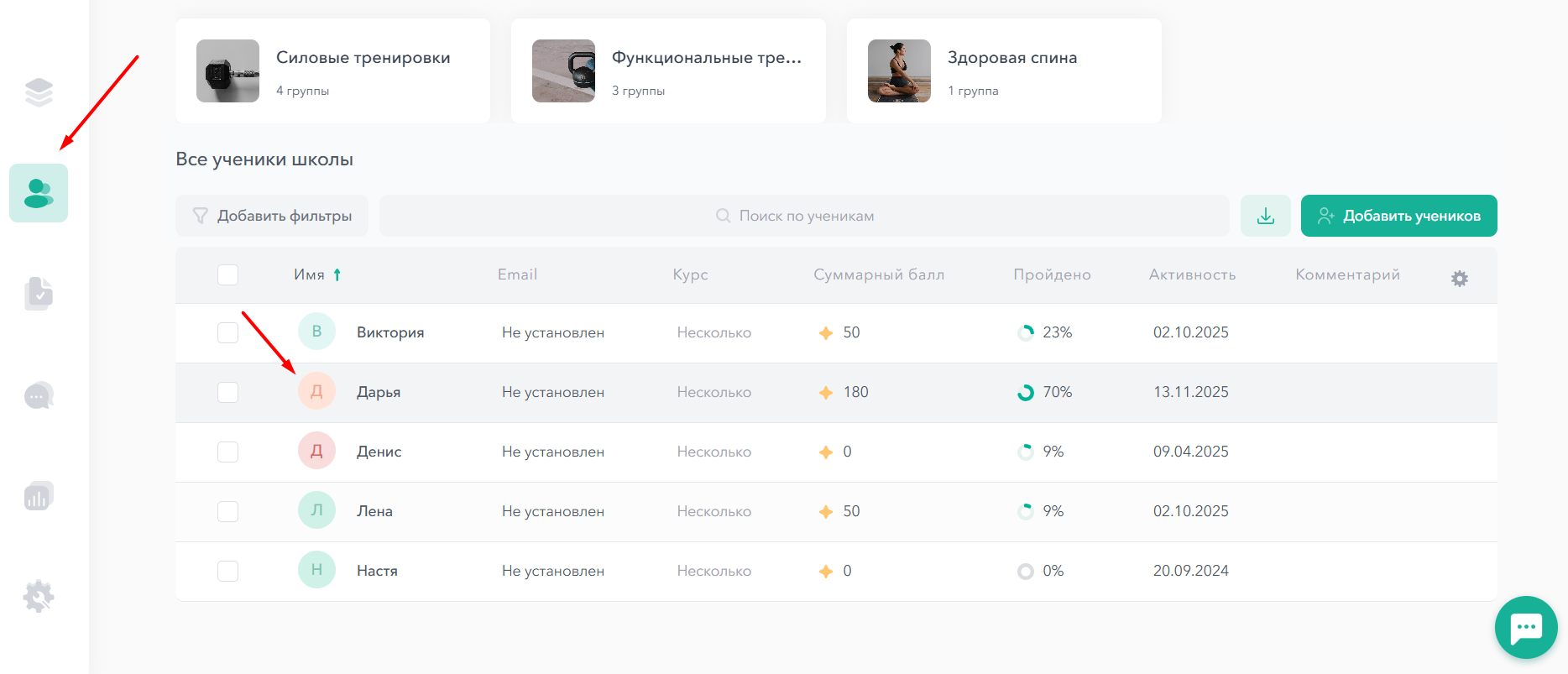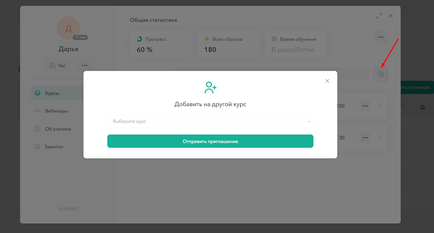 Вы можете добавить ученика на другой курс, нажав на иконку добавления: