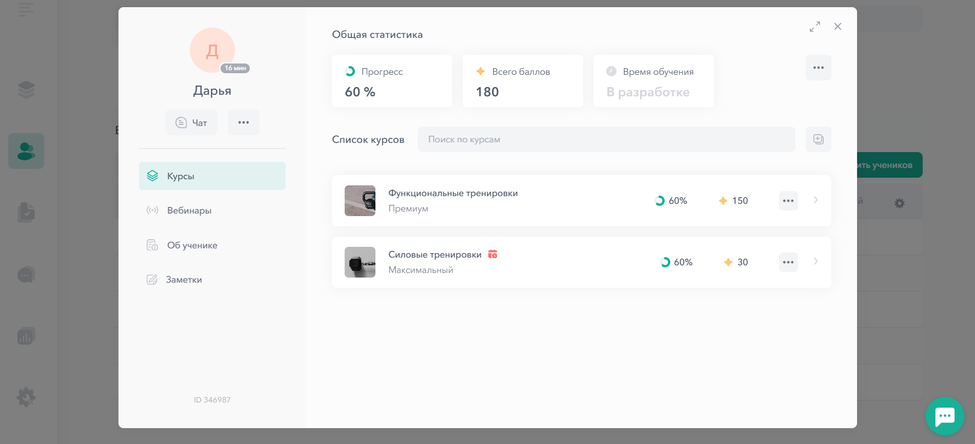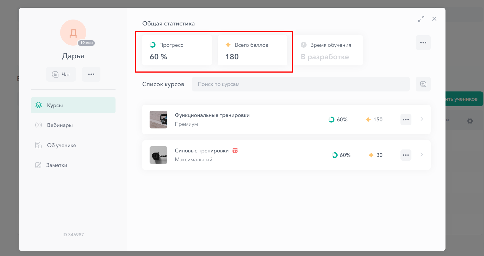 В общей статистике отображается общий прогресс прохождения всех курсов, на которые добавлен ученик: