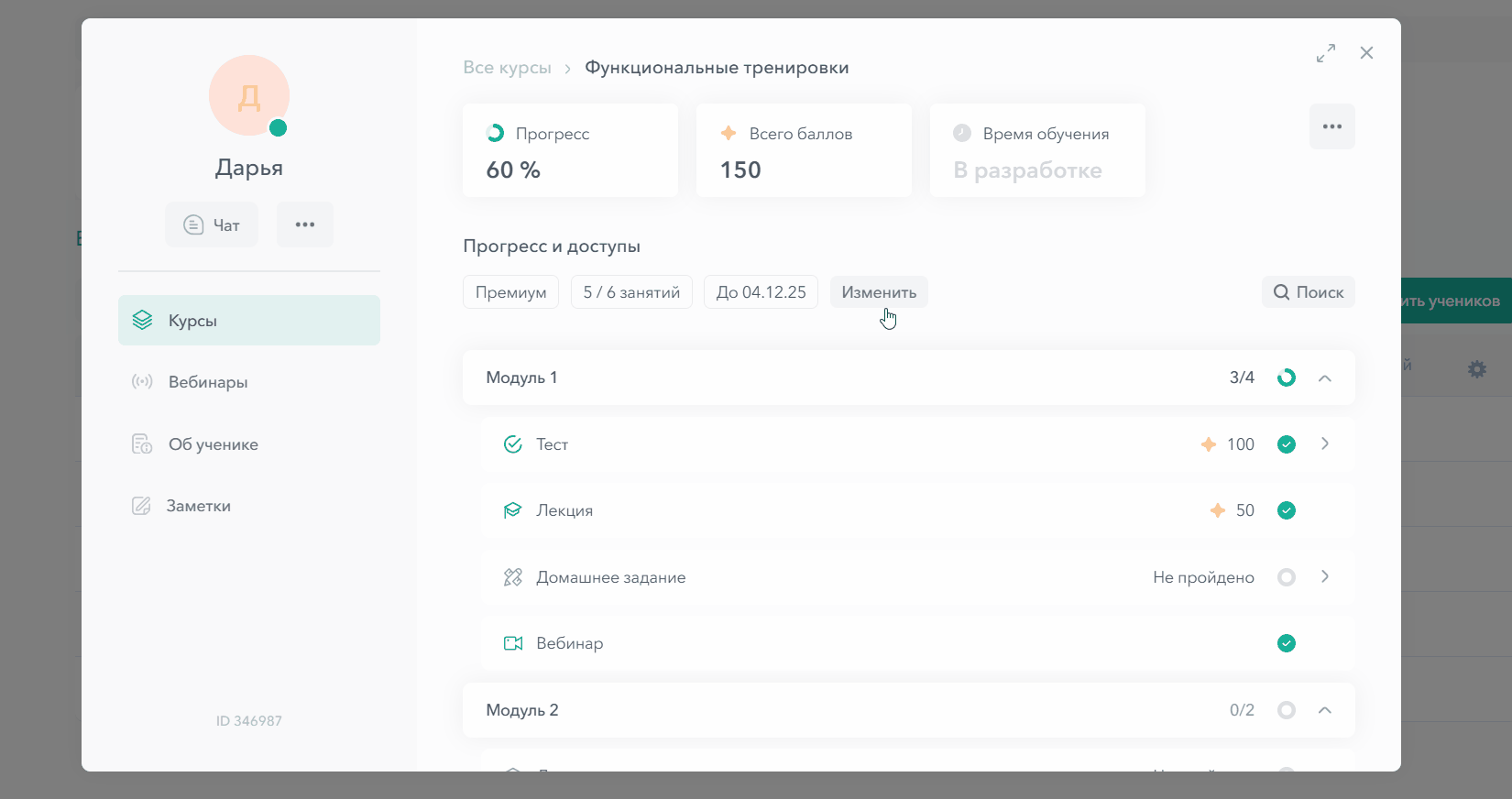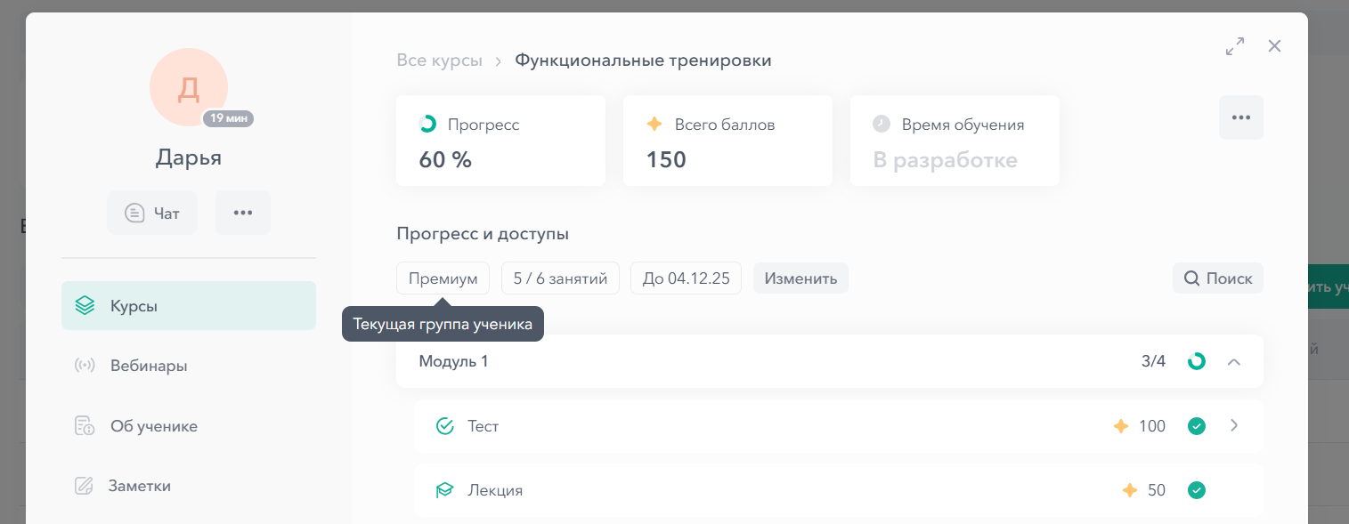 После добавления ученика на курс создается карточка ученика с его личными данными и информацией о прогрессе обучения. Также, можно добавлять ученика на другие курсы, включать индивидуальные настройки доступа к курсам и др. В этой статье разбираем функционал.