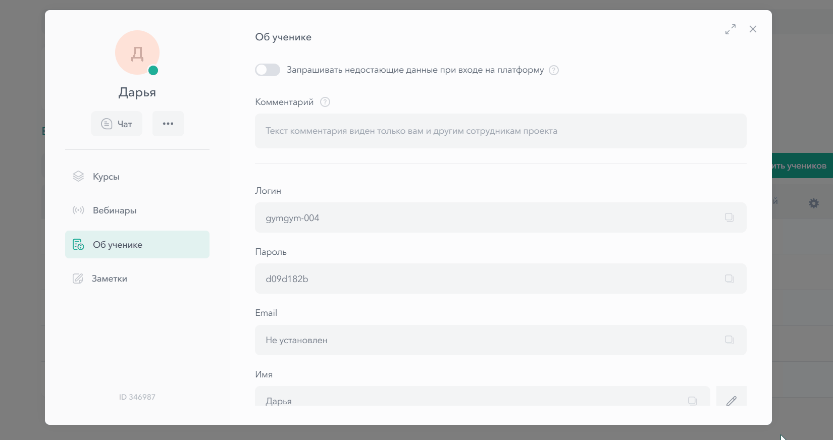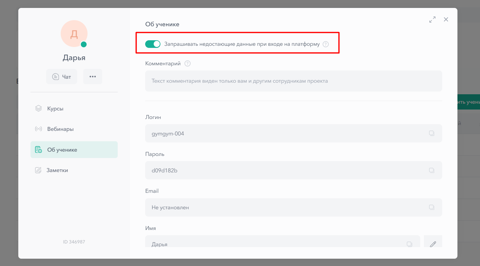 Вы можете включить функцию «Запрашивать недостающие данные при входе на платформу». У всех учеников при первом входе в аккаунт будут запрашиваться недостающие в карточке данные. Начать обучение можно будет только после заполнения всех полей.
