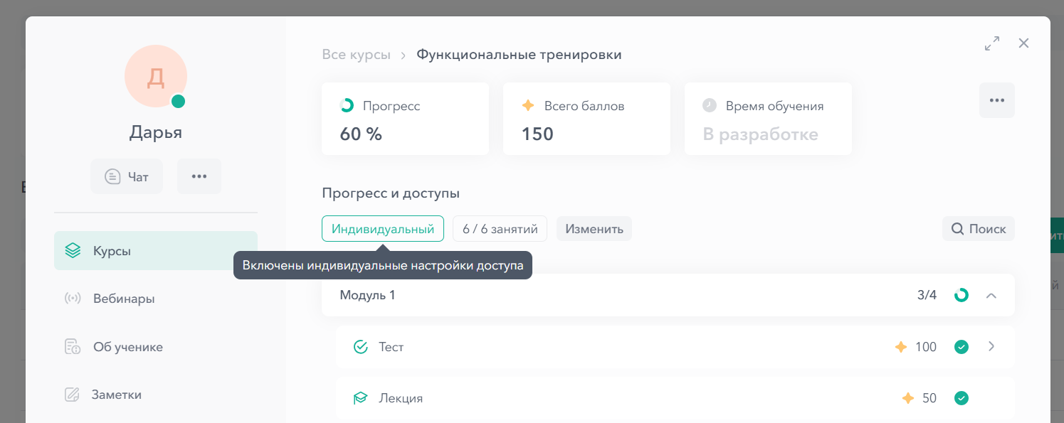 В режиме индивидуального доступа можно изменить срок доступа к курсу и доступ к занятиям. Все остальные настройки группы продолжают действовать.