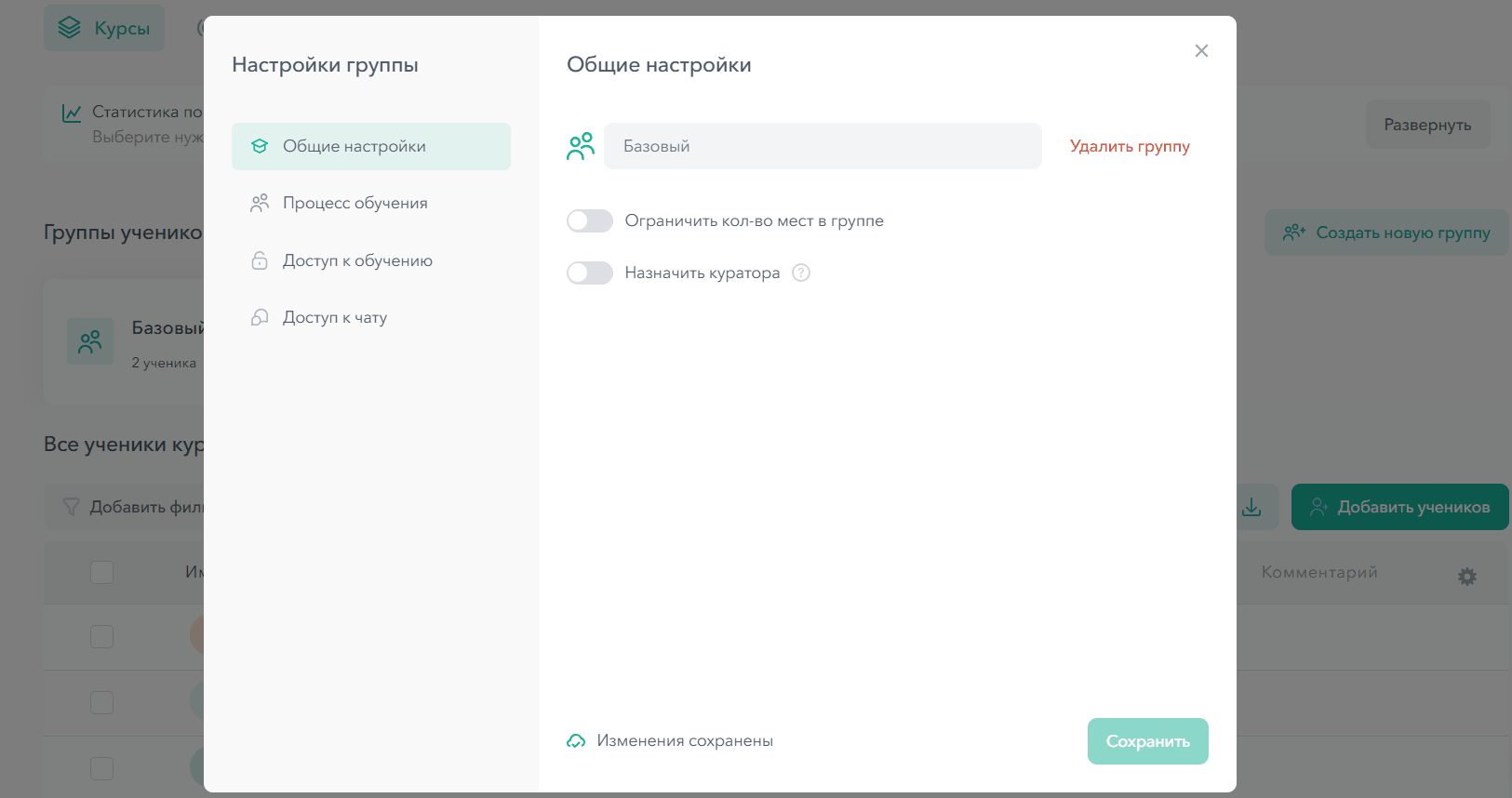 - Выбрать, какие модули и уроки будут доступны ученикам данной группы
