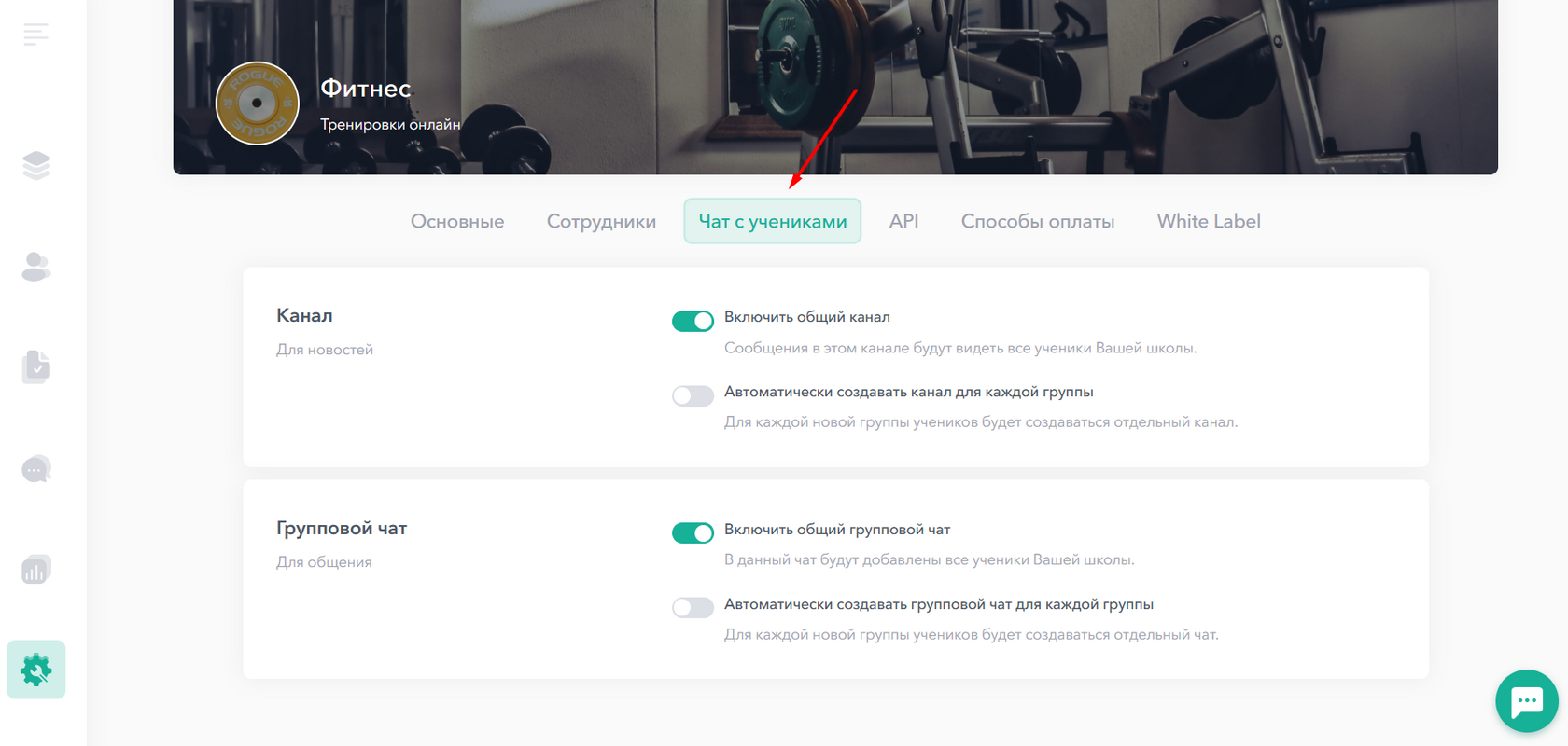 В разделе Настройки школы — Чат с учениками Вы можете вкл/выкл общий канал и общий групповой чат для всех учеников Вашей школы, а также включить автоматическое создание канала и группового чата для каждой группы: