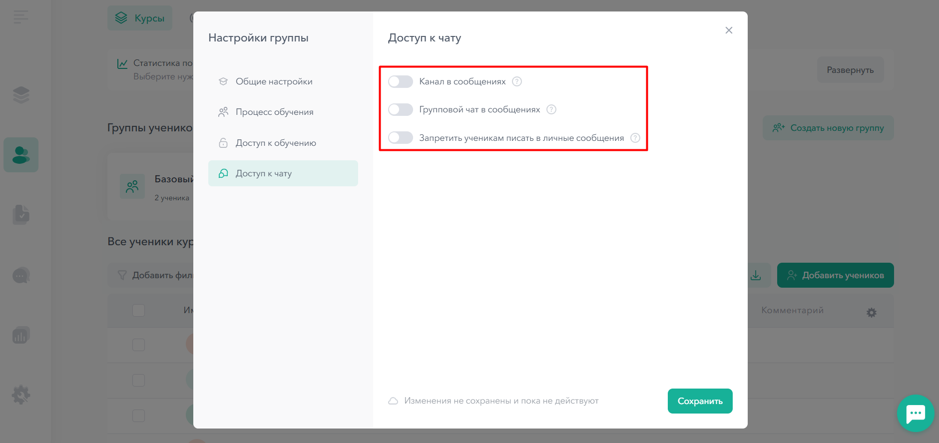 В разделе Ученики и аналитика — Группы учеников — Настройки группы — подраздел Основное, Вы можете вкл/выкл канал и групповой чат для конкретной группы учеников, а также запретить ученикам этой группы писать в личные сообщения сотрудникам, назначенным на этот курс: